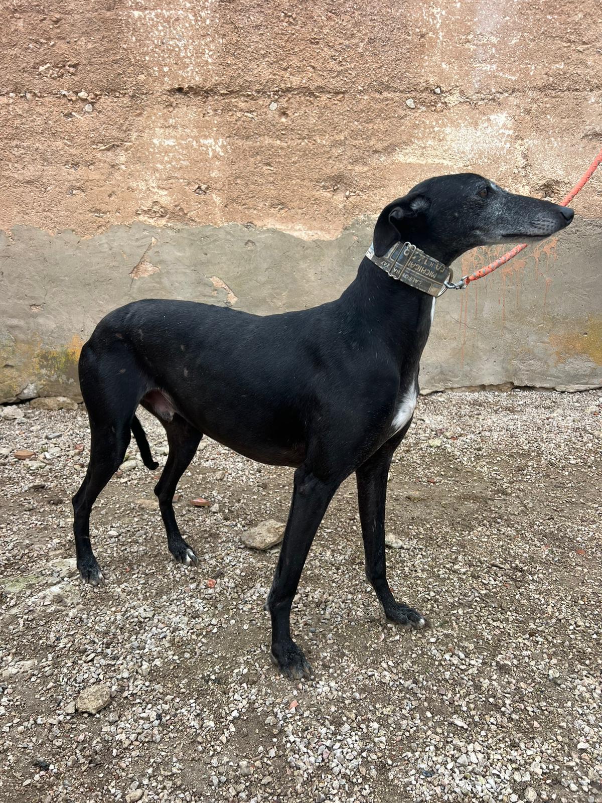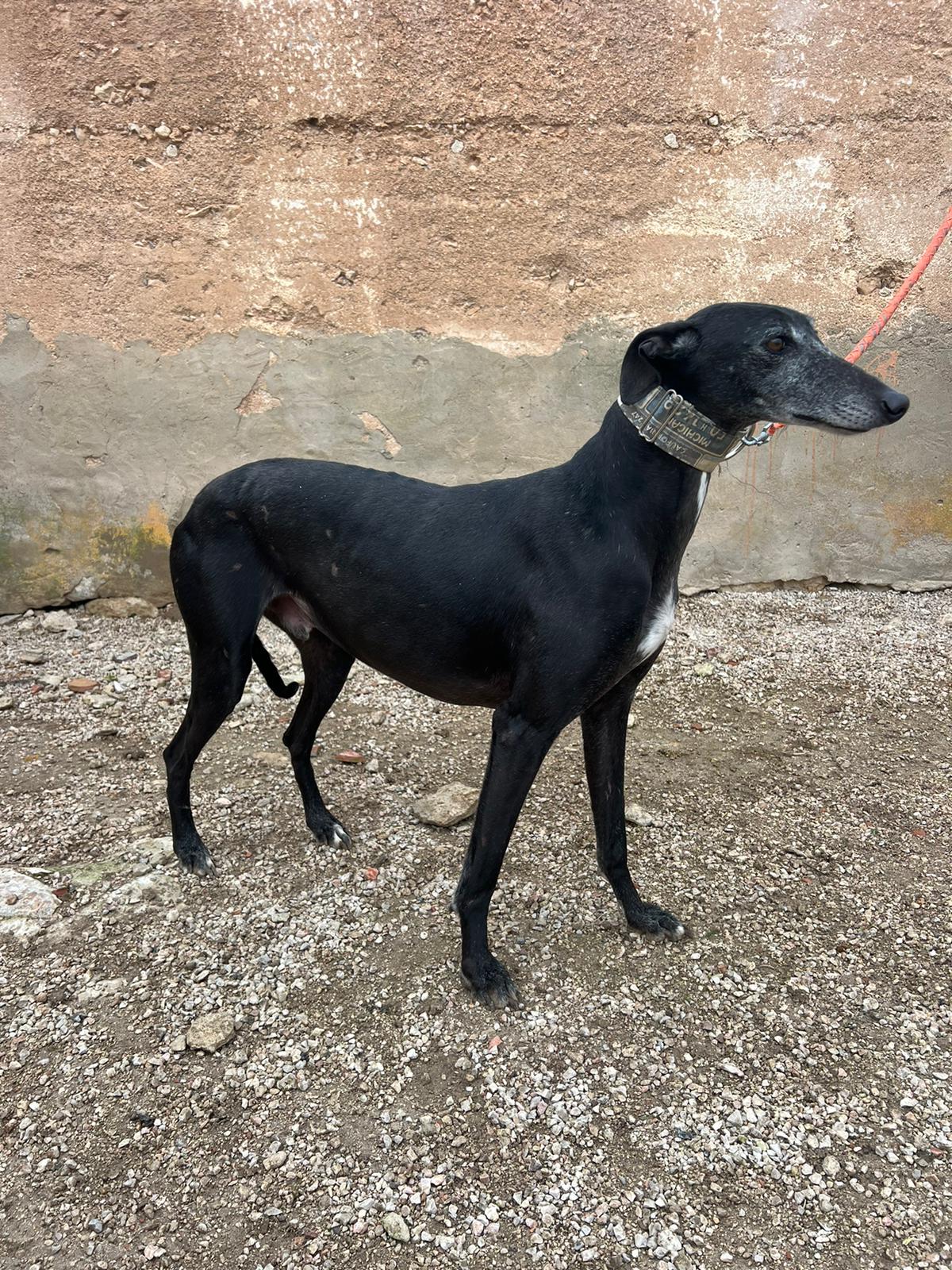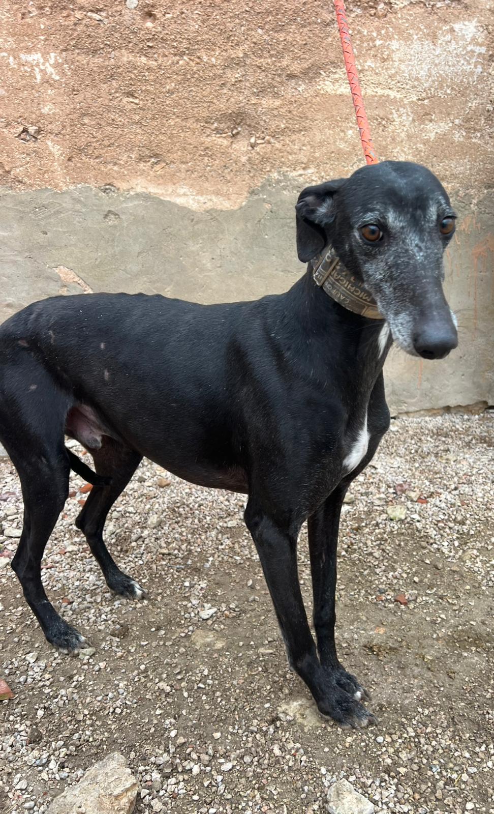 Tiene unos 5 o 6 años y fue rescatado junto con otros 16 galgos de una situación muy difícil. Lara lo describe como un infierno.