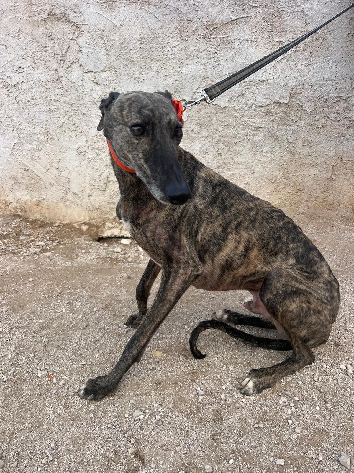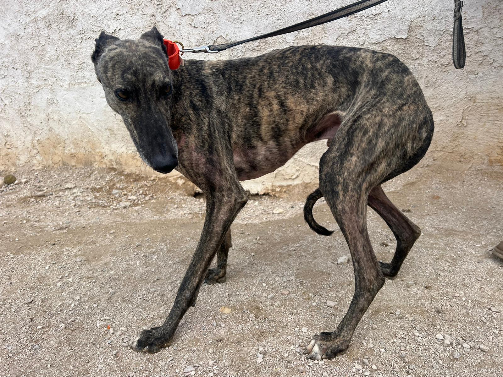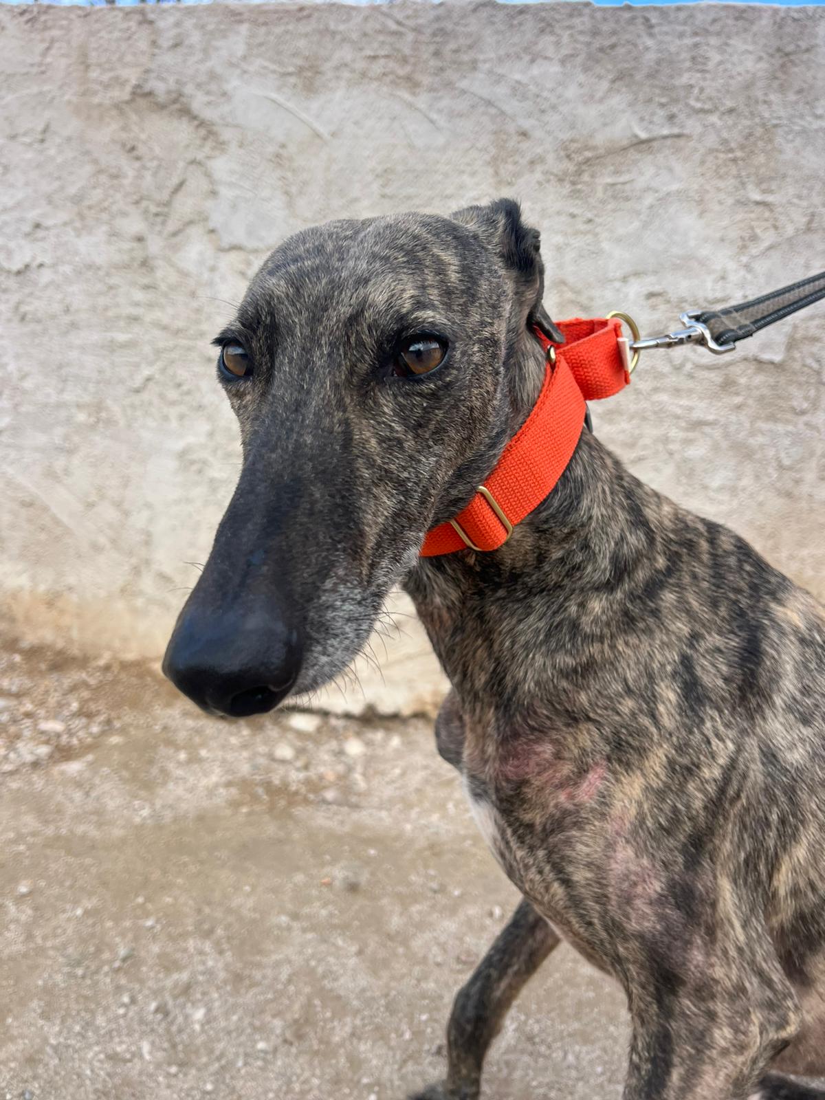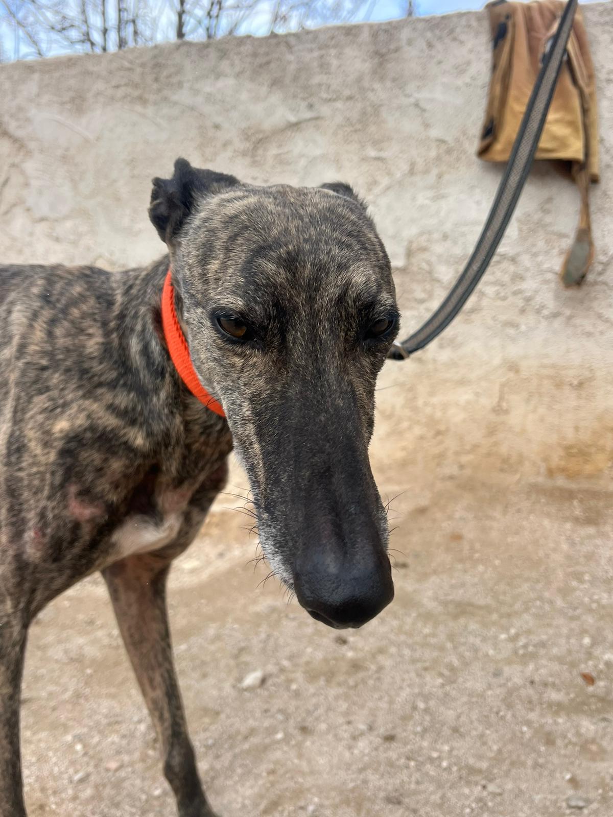 Félix es un galgo de unos 7-8 años.