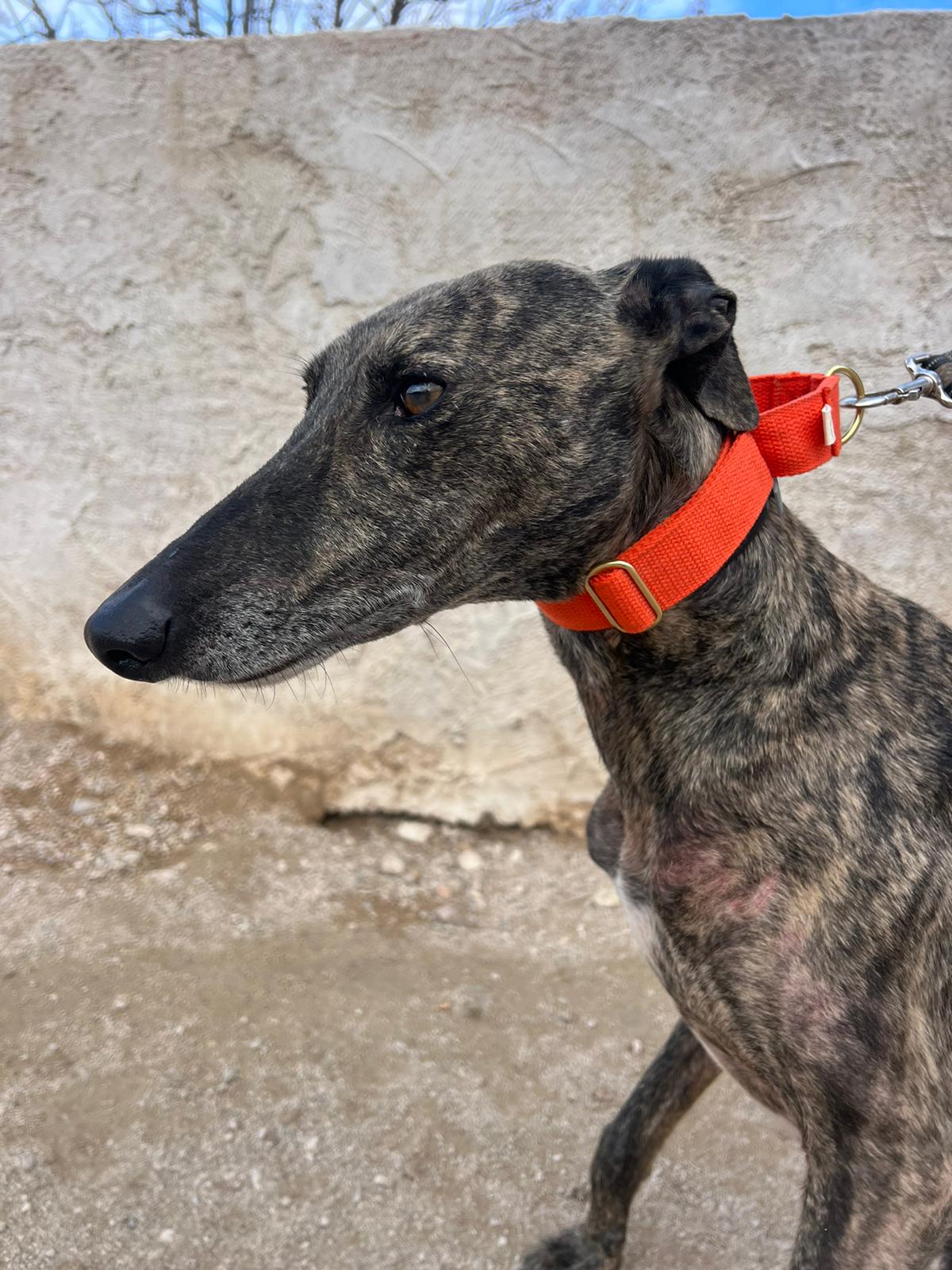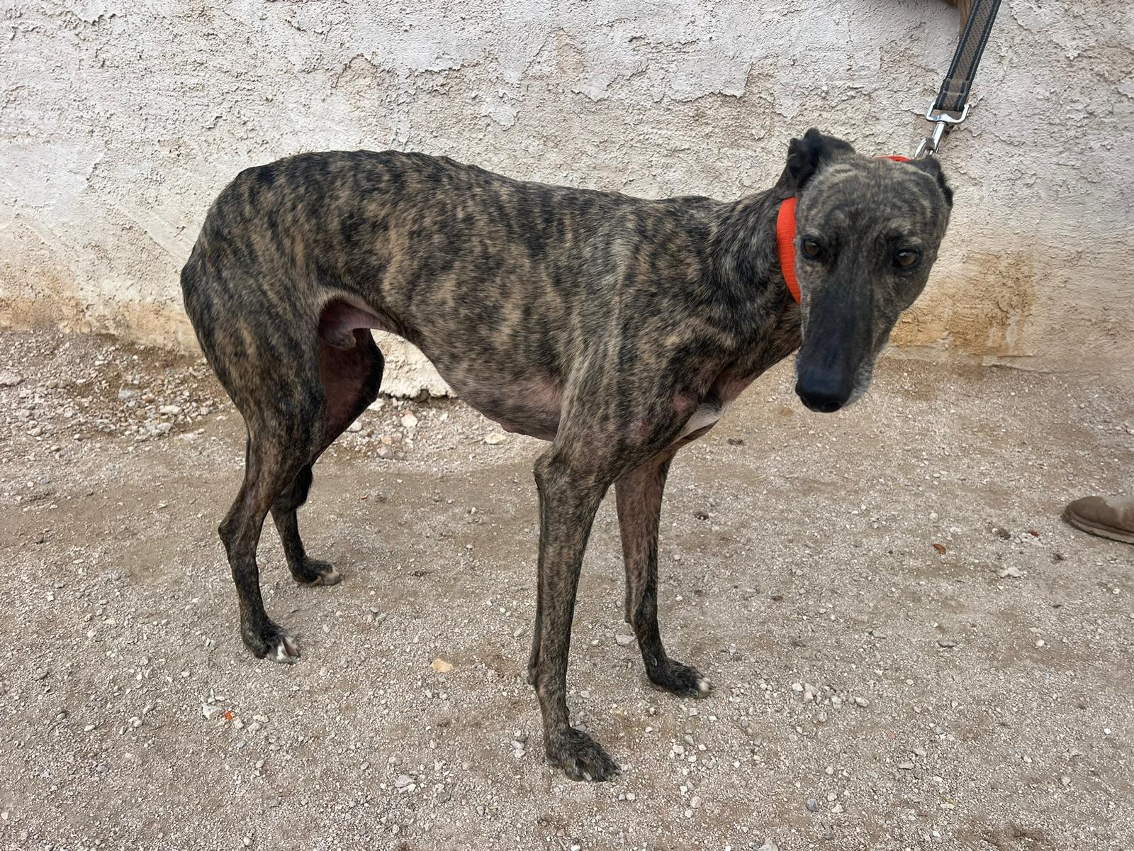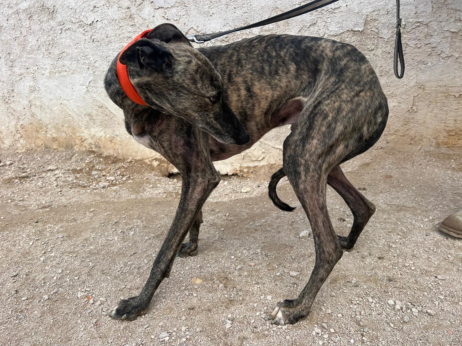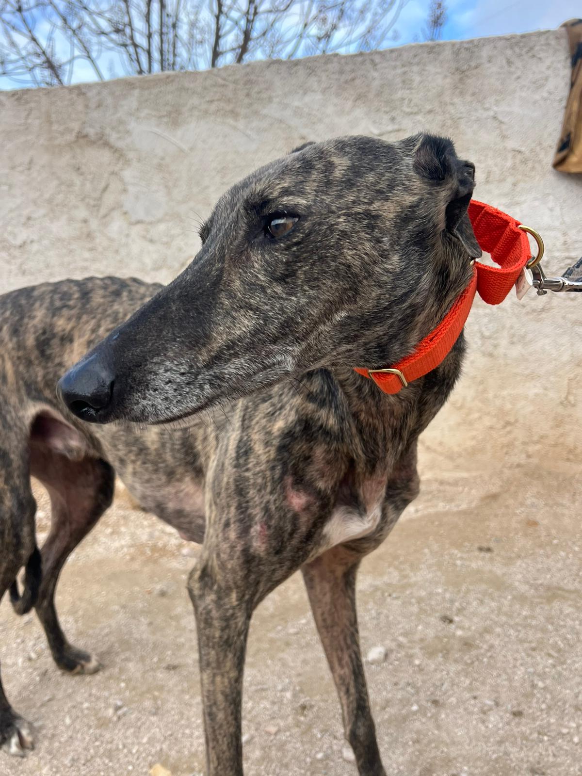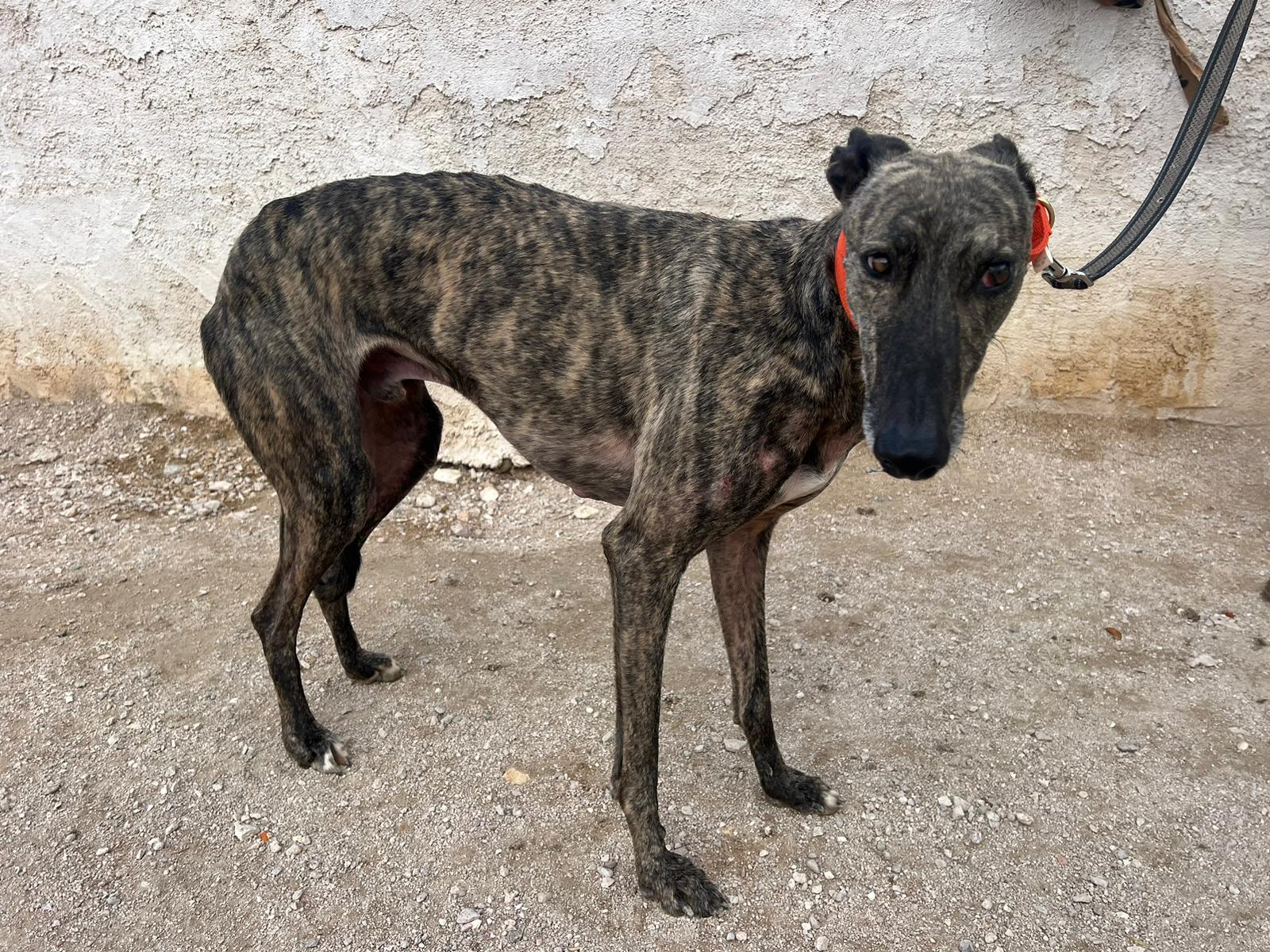 Félix es un galgo de unos 7-8 años.