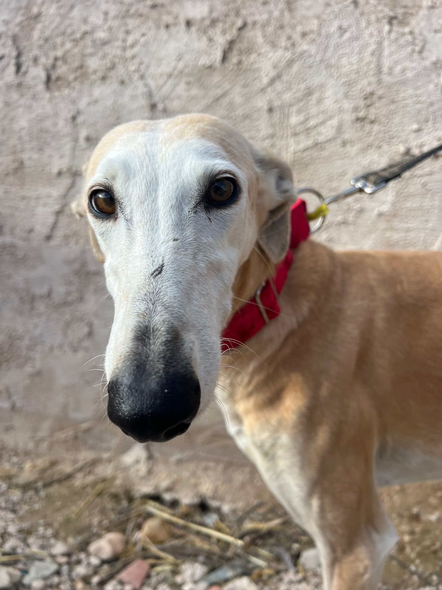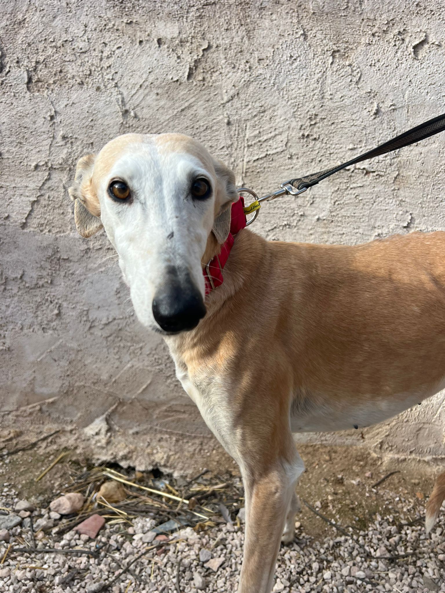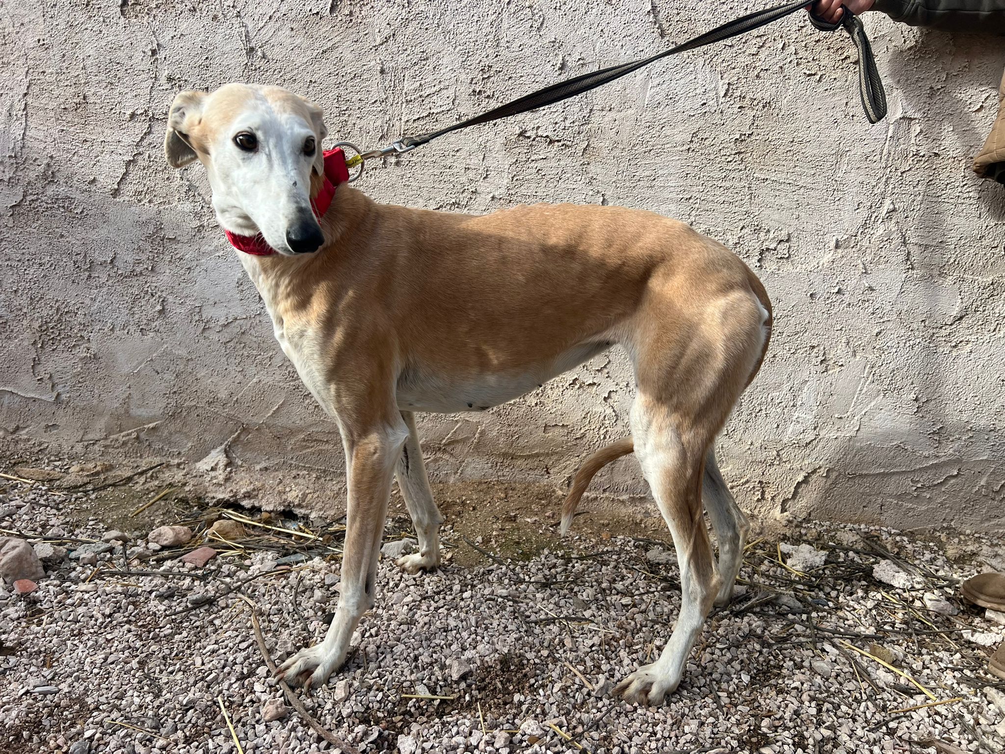 Loli es una galga preciosa, tranquila, muy buena con otros perros y muy cariñosa con la gente.