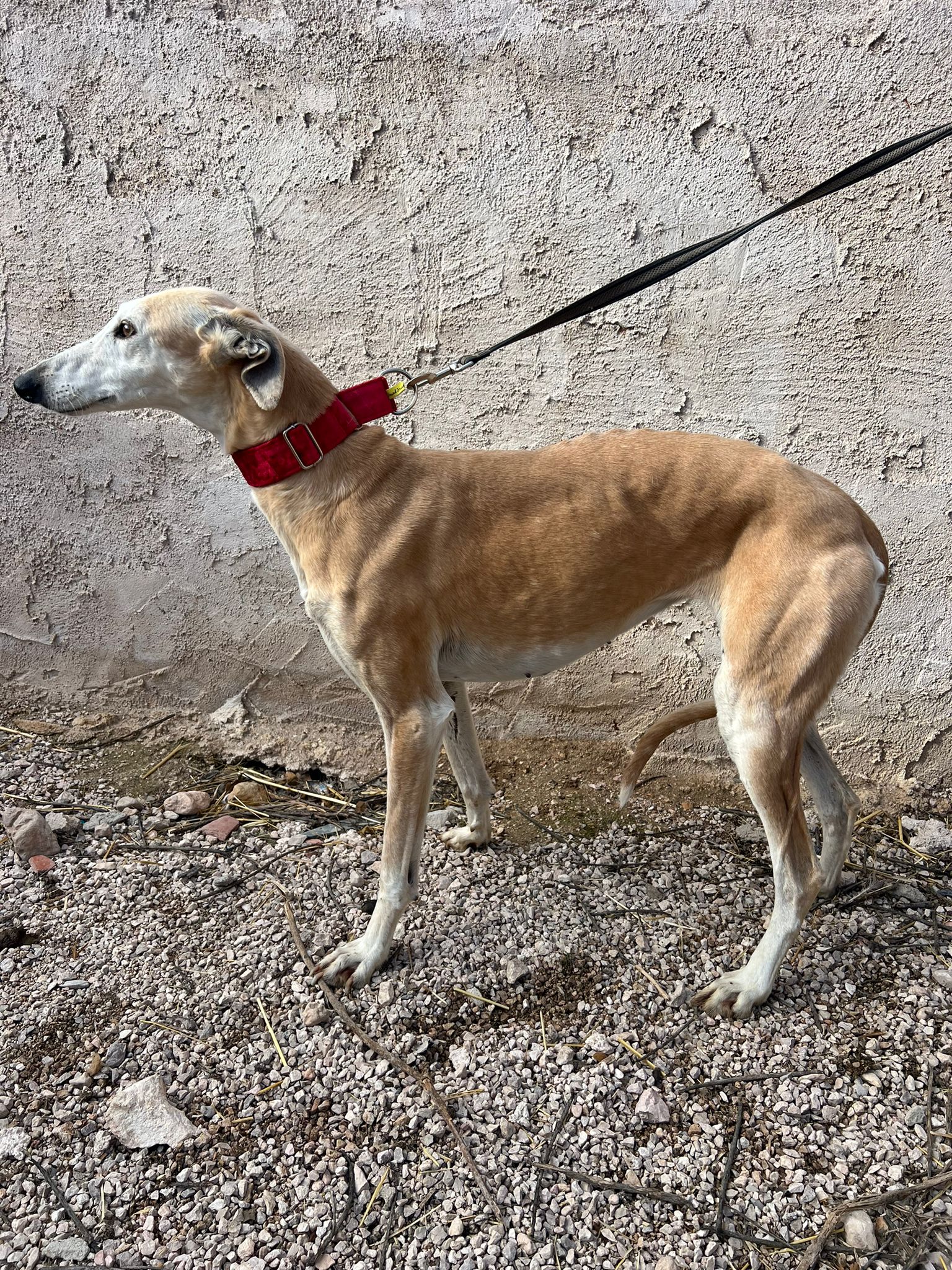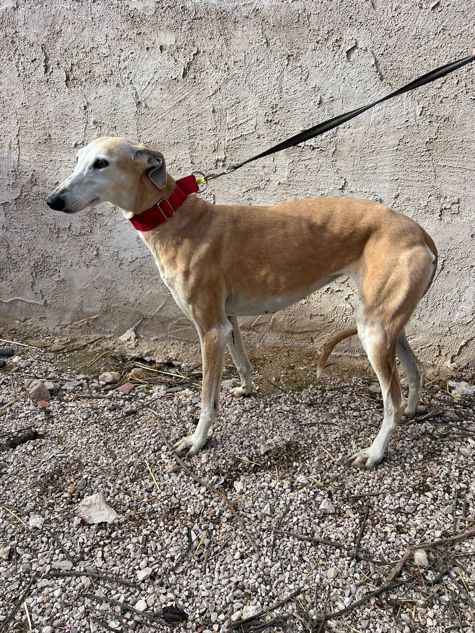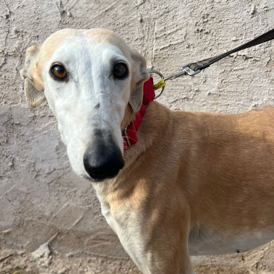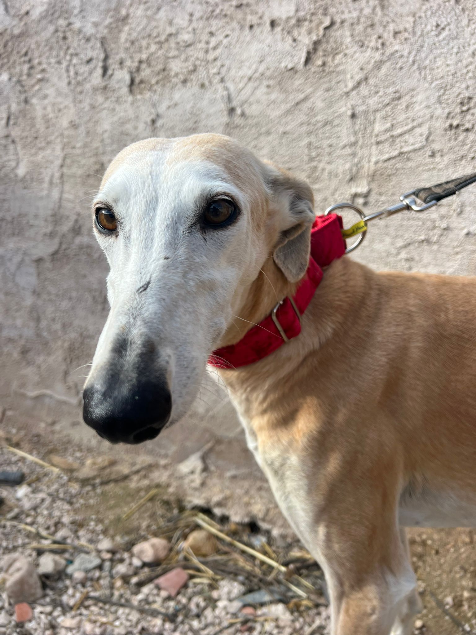 Loli es una galga preciosa, tranquila, muy buena con otros perros y muy cariñosa con la gente.