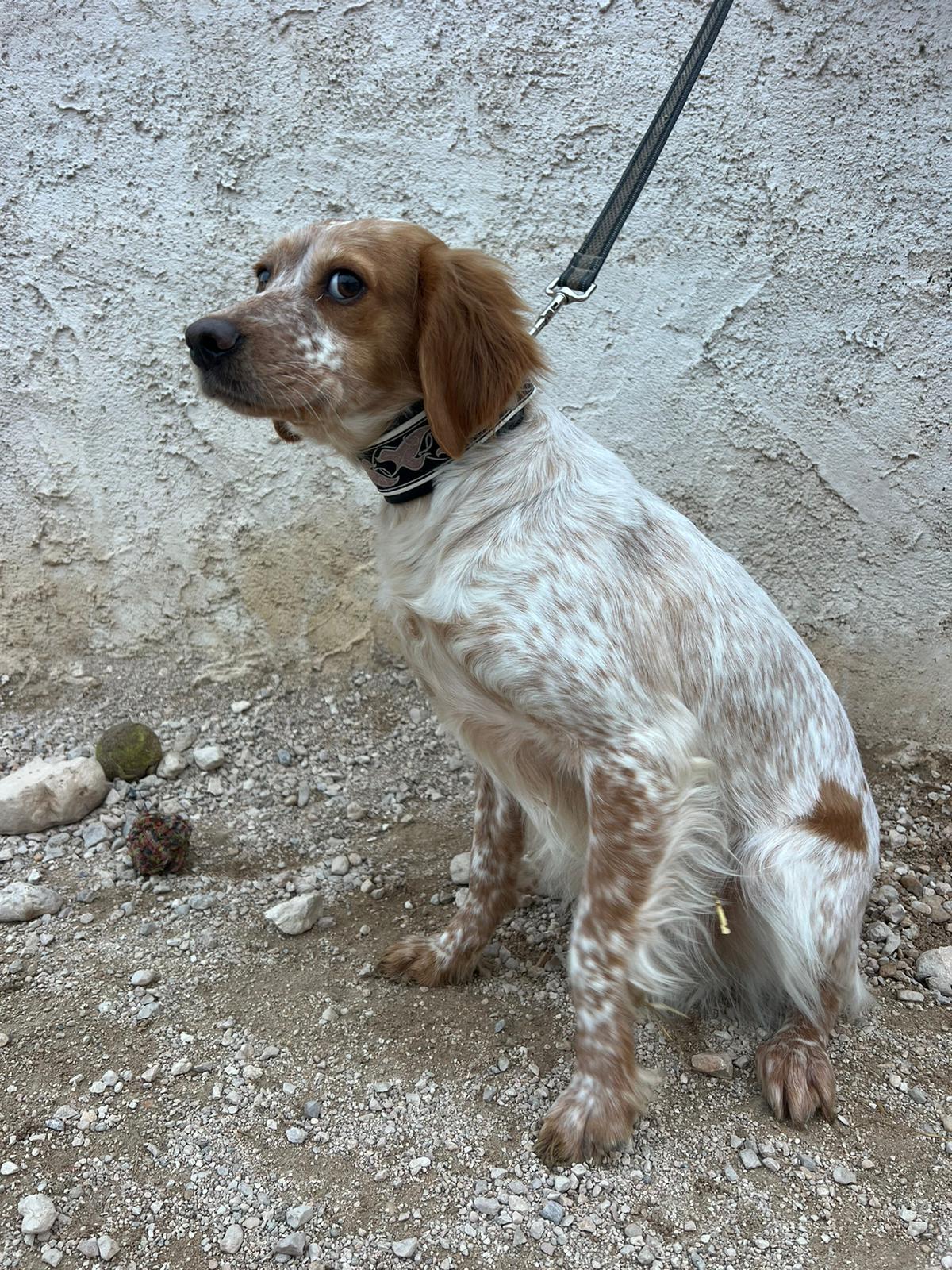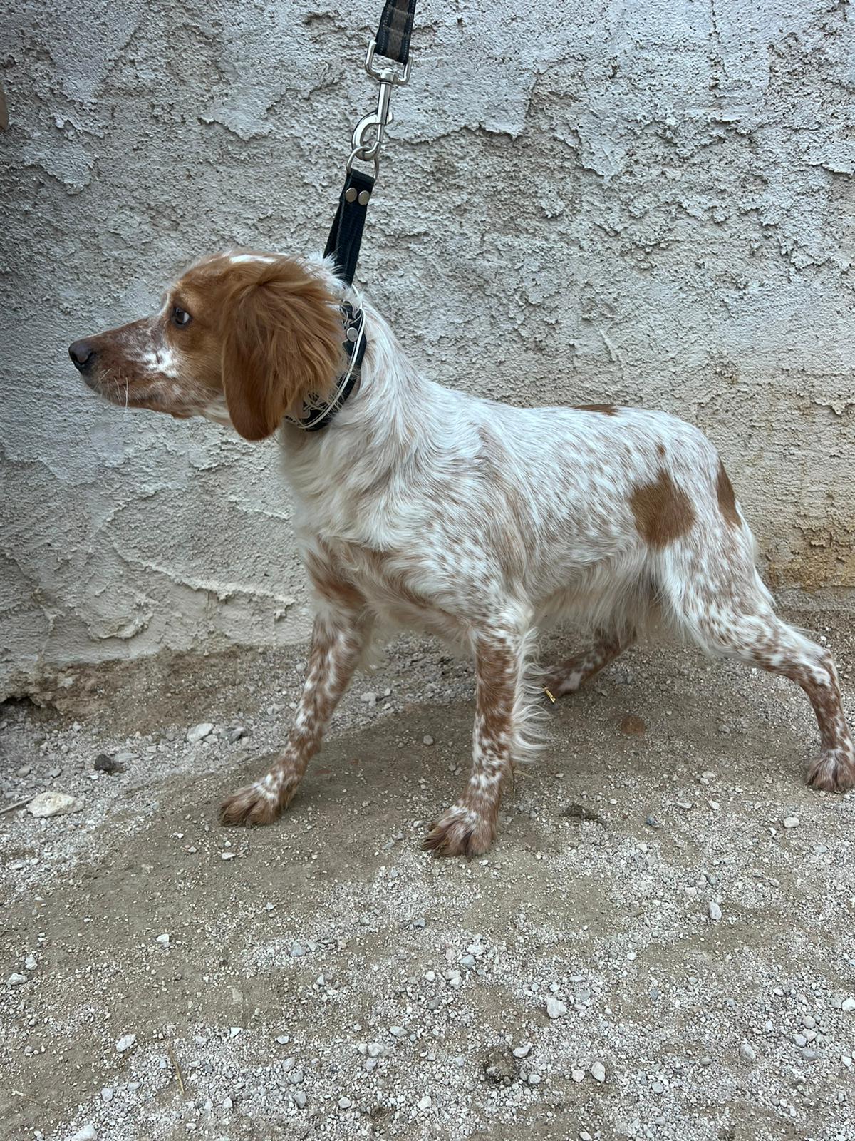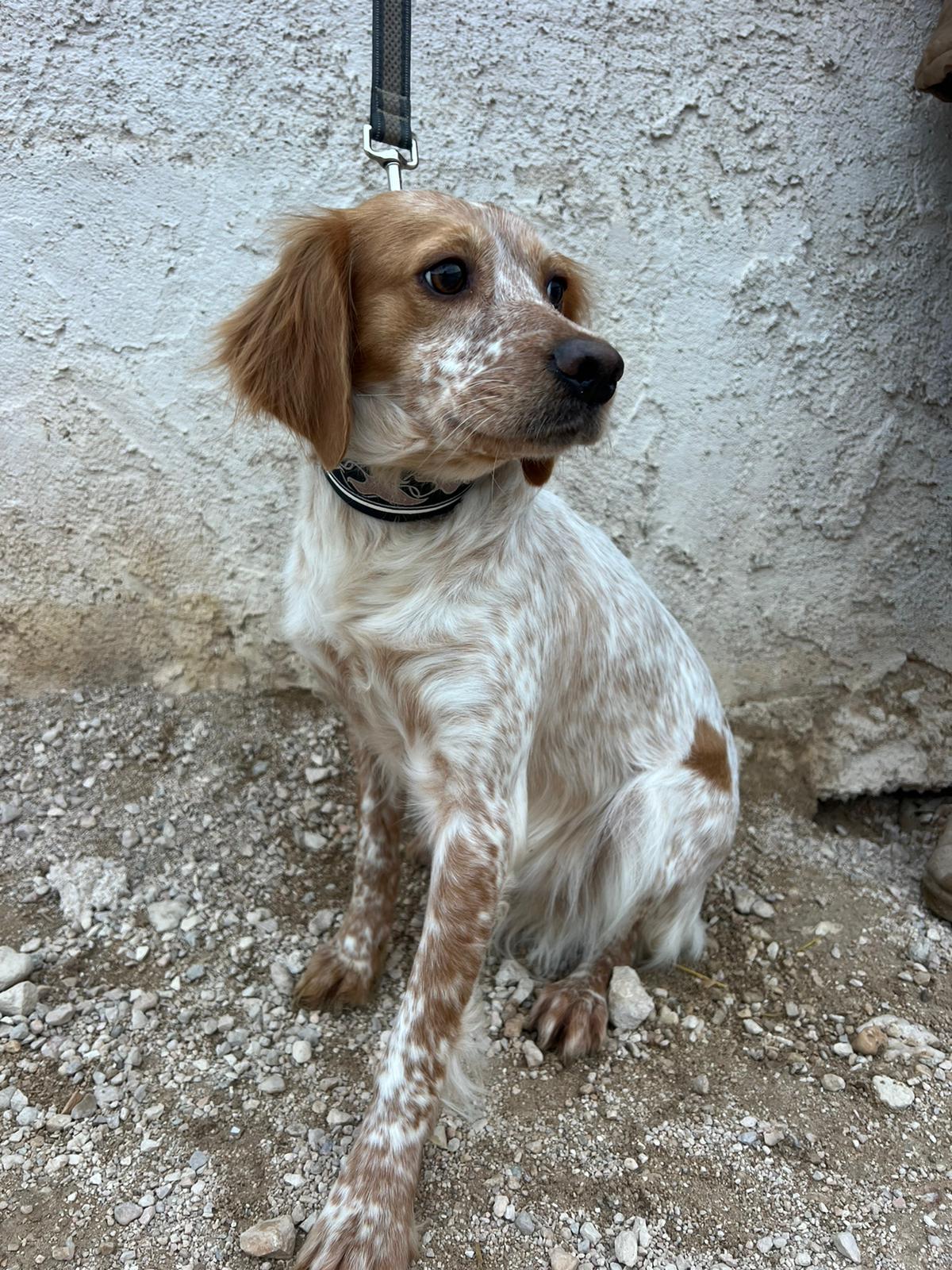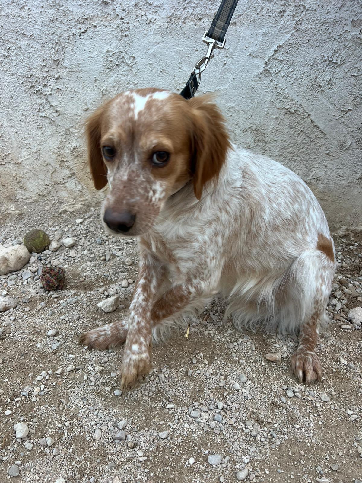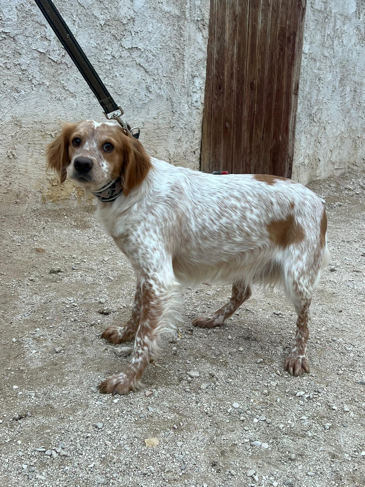 Piña es una perrita bretona de 2-3 años. Es muy asustadiza, por lo que necesita gente con experiencia. Es la mejor amiga del galgo Pistacho y siempre lo sigue, ya que fueron rescatados juntos de la calle.