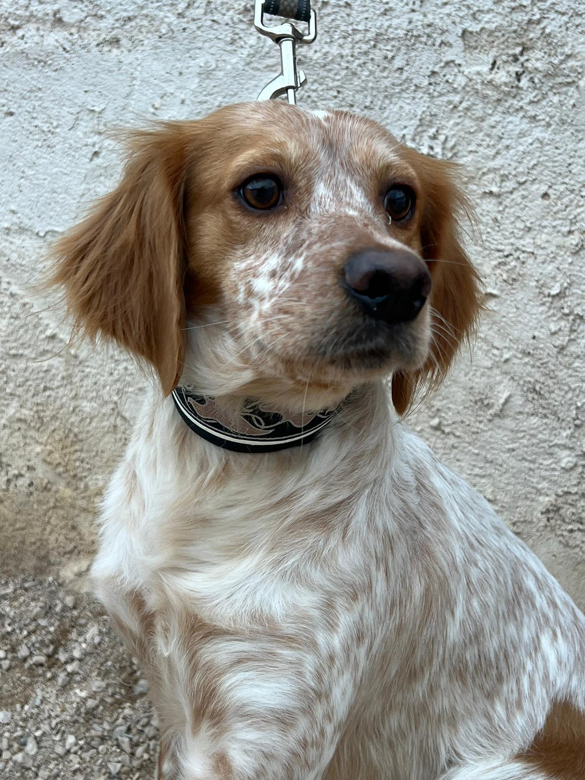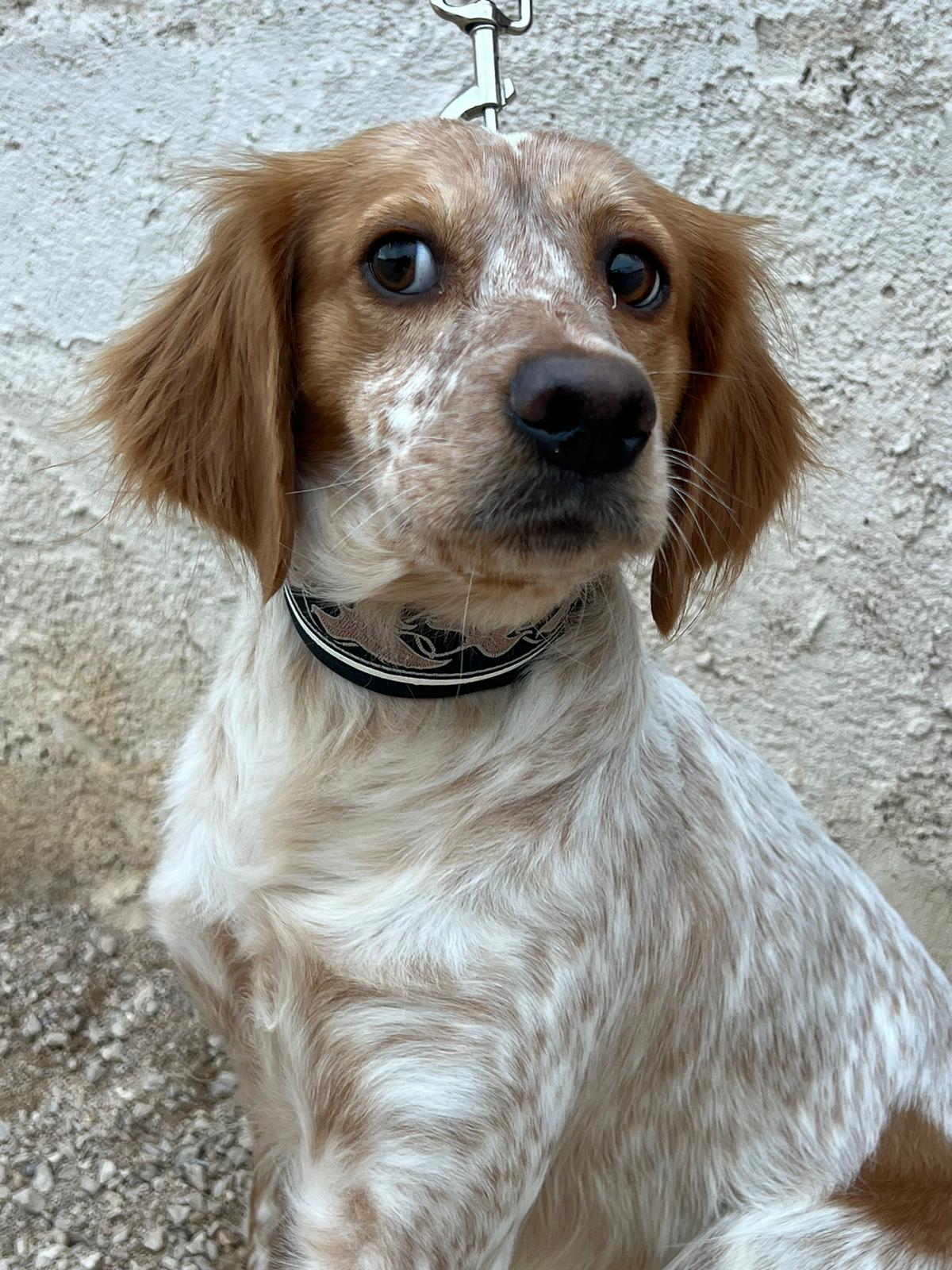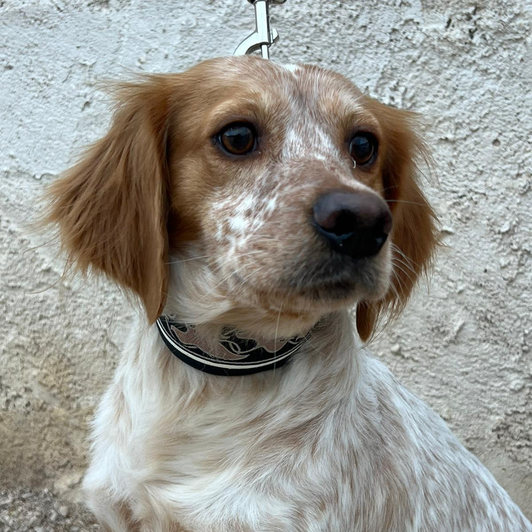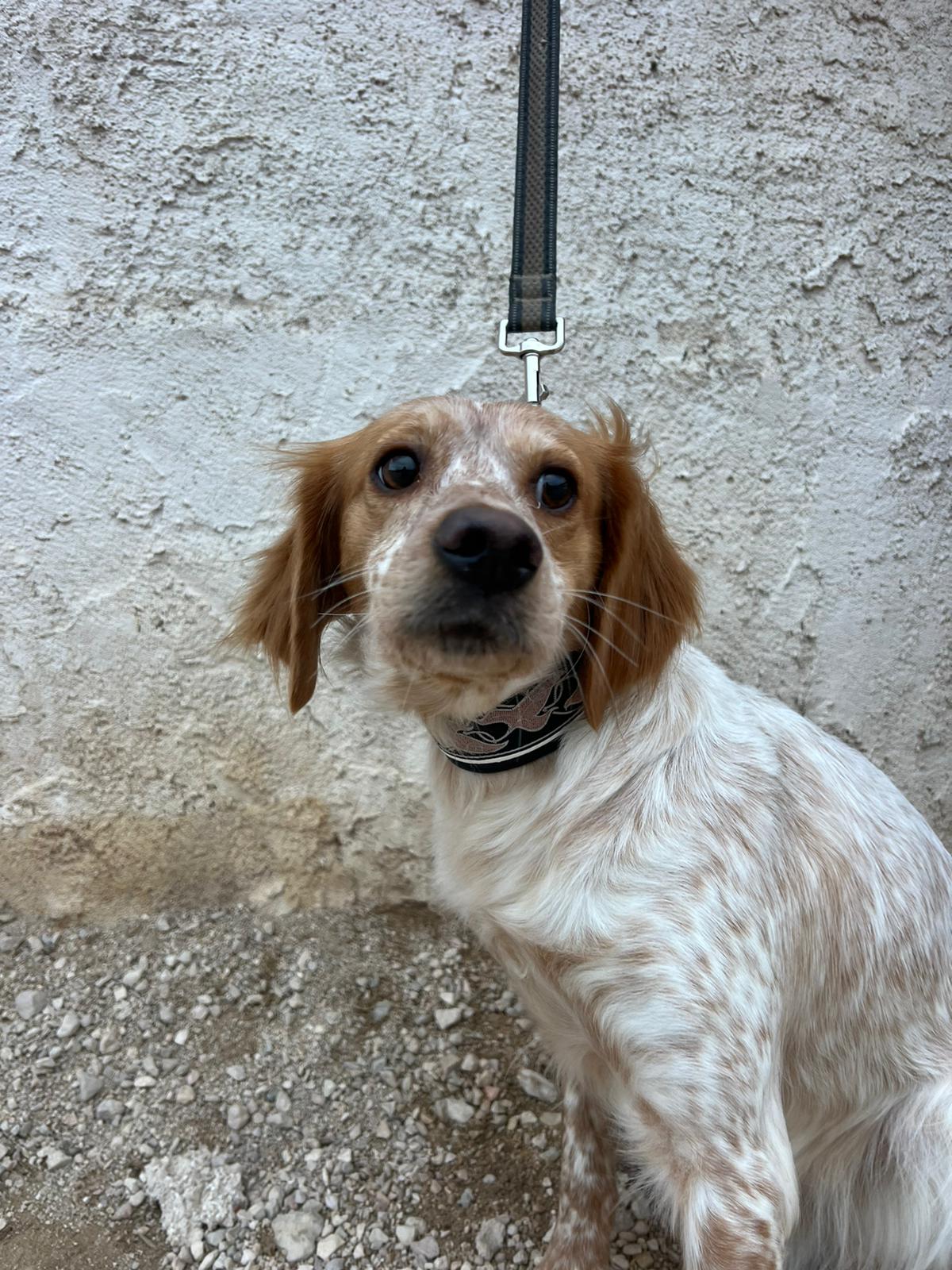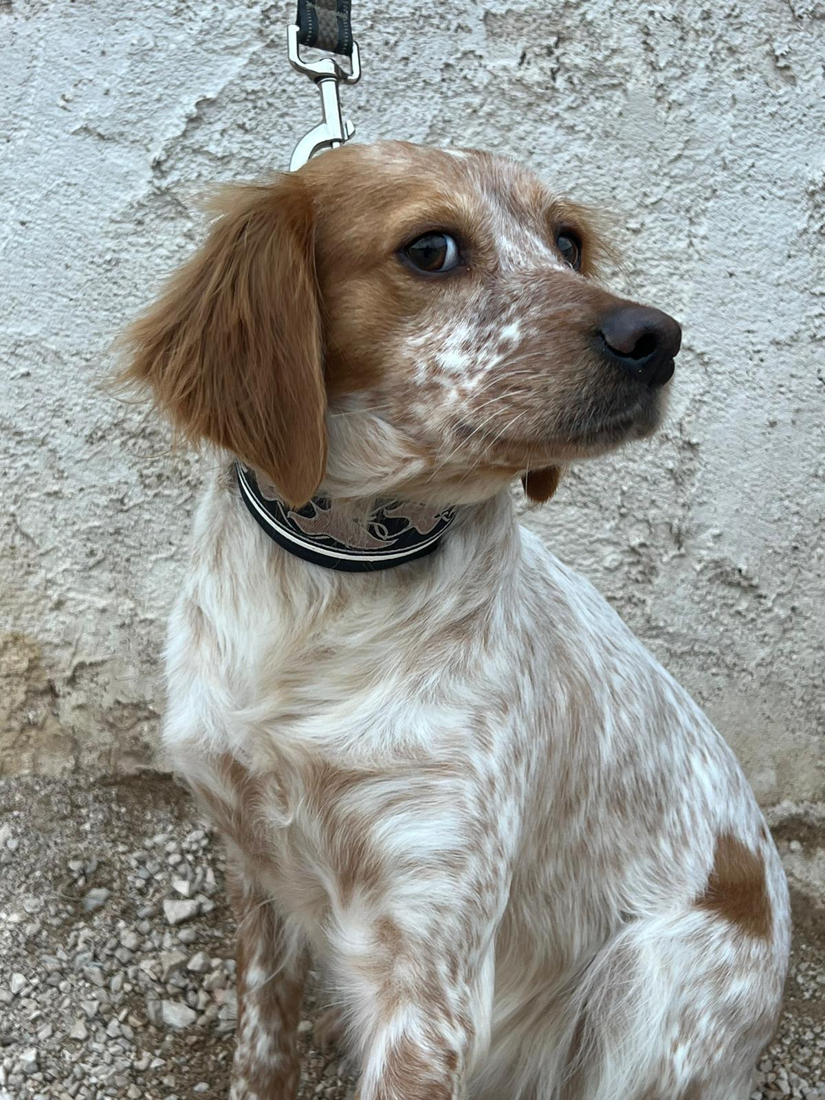 Piña es una perrita bretona de 2-3 años. Es muy asustadiza, por lo que necesita gente con experiencia. Es la mejor amiga del galgo Pistacho y siempre lo sigue, ya que fueron rescatados juntos de la calle.