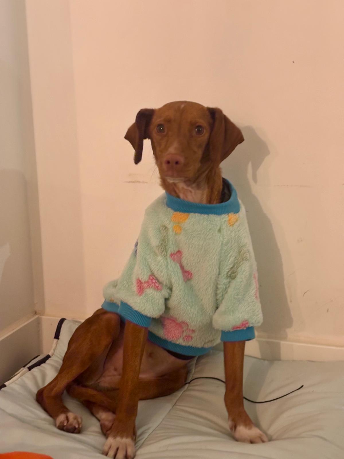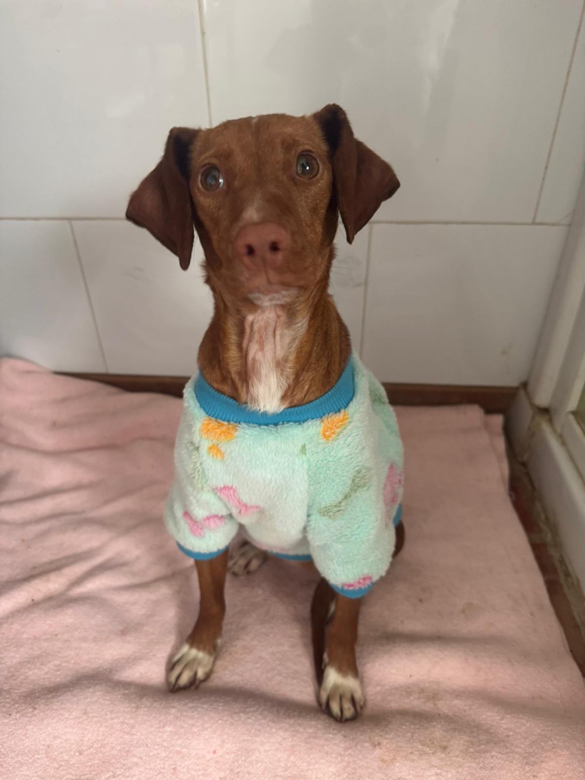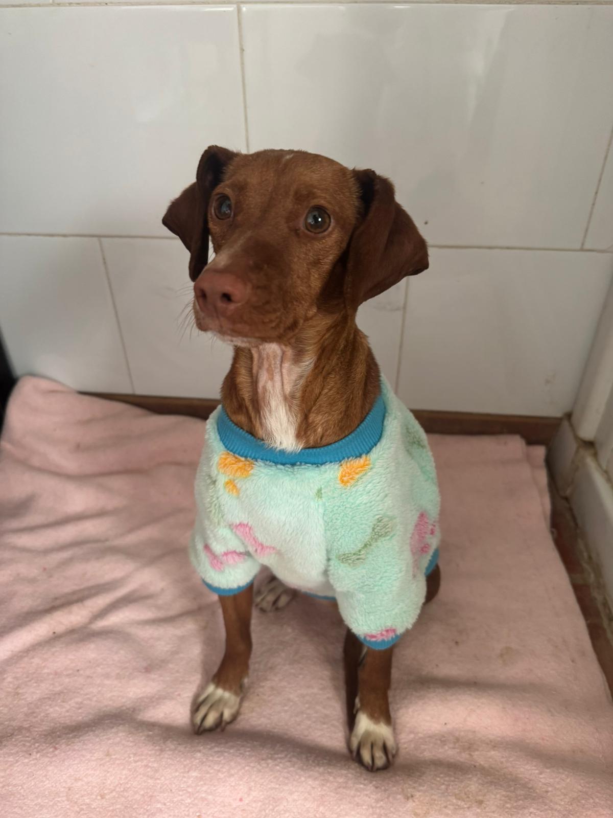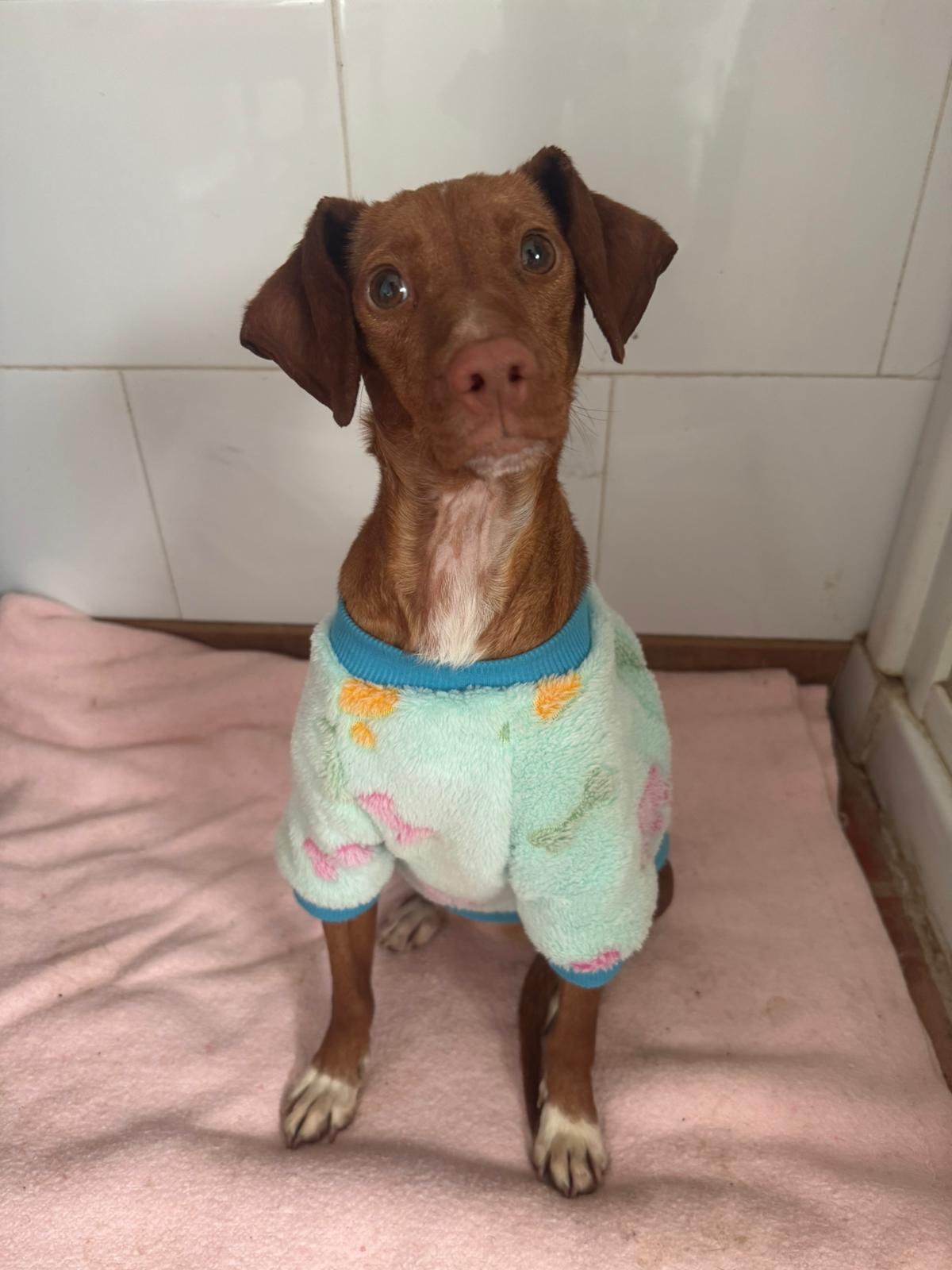 La pequeña Tina pesa unos 5 kilos y es una mestiza de podenco. Tenía la barriga muy hinchada, lo que la hacía parecer embarazada, pero probablemente se deba a la mala alimentación que ha consumido.