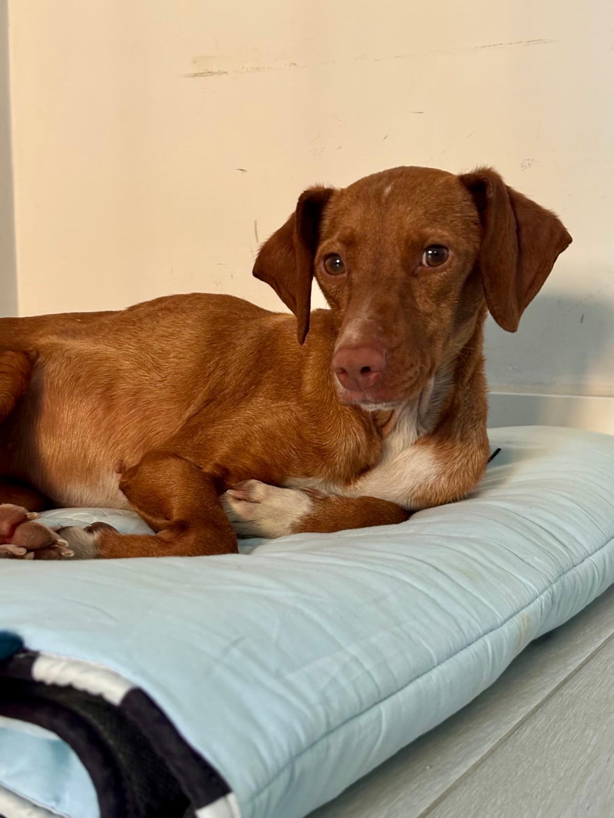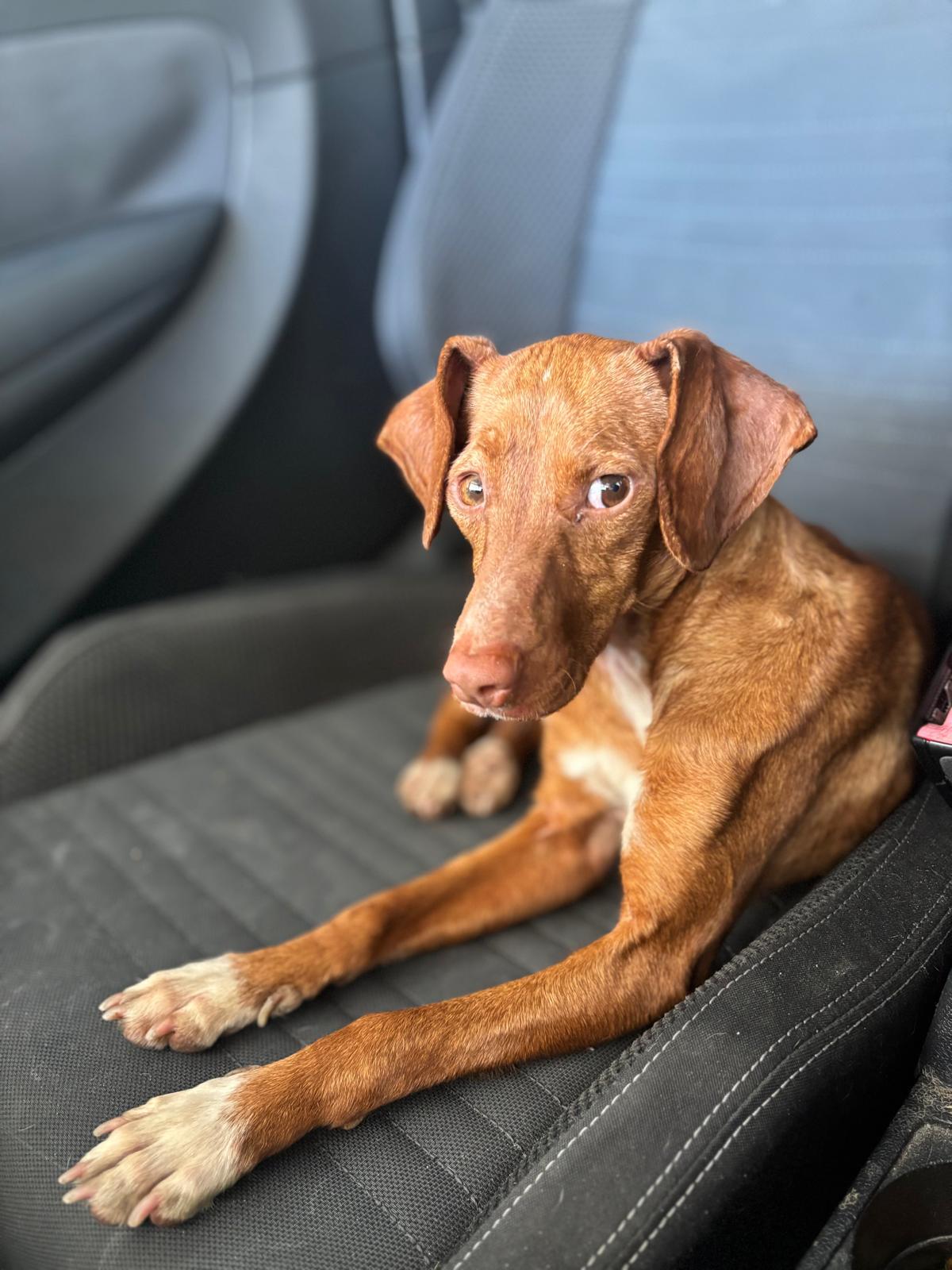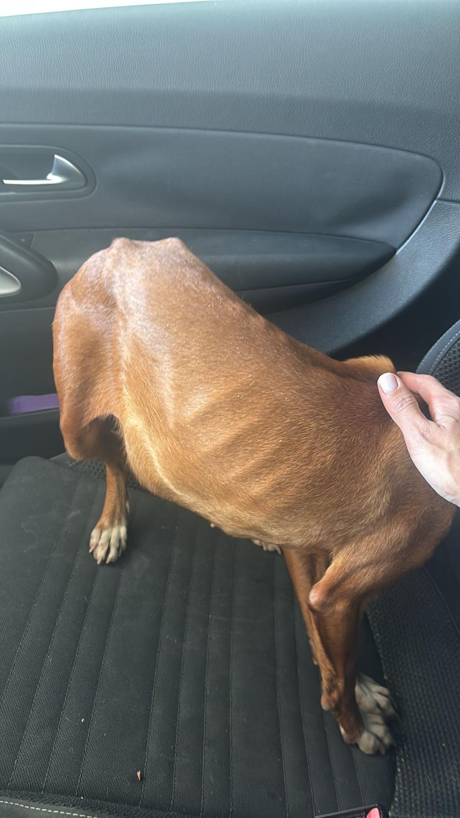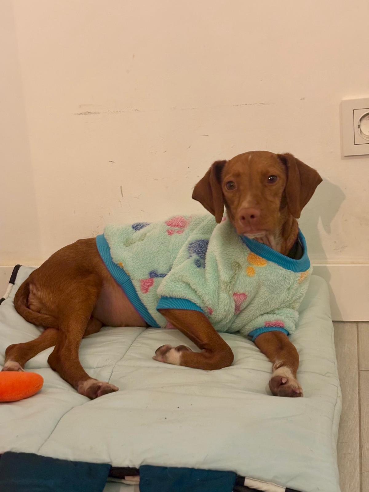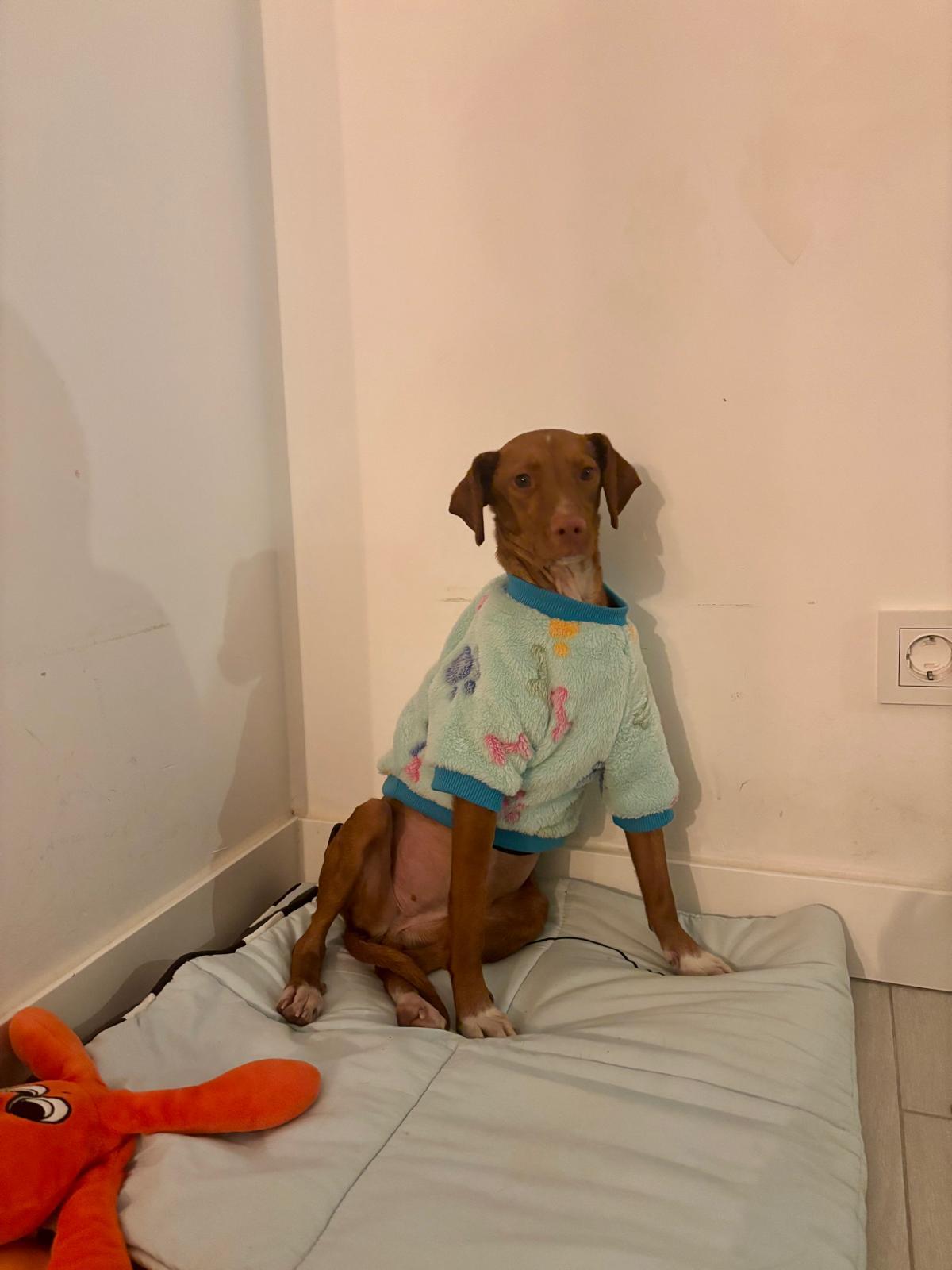 La pequeña Tina pesa unos 5 kilos y es una mestiza de podenco. Tenía la barriga muy hinchada, lo que la hacía parecer embarazada, pero probablemente se deba a la mala alimentación que ha consumido.