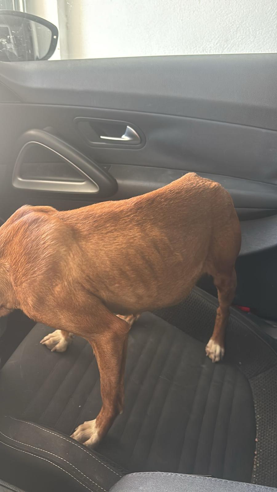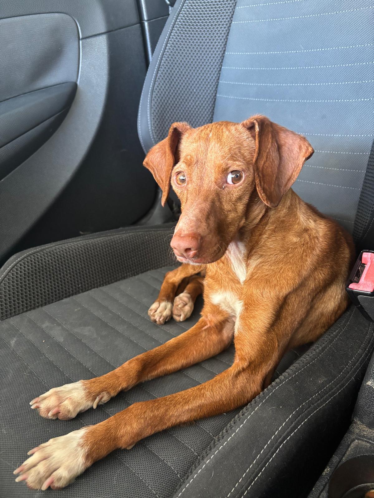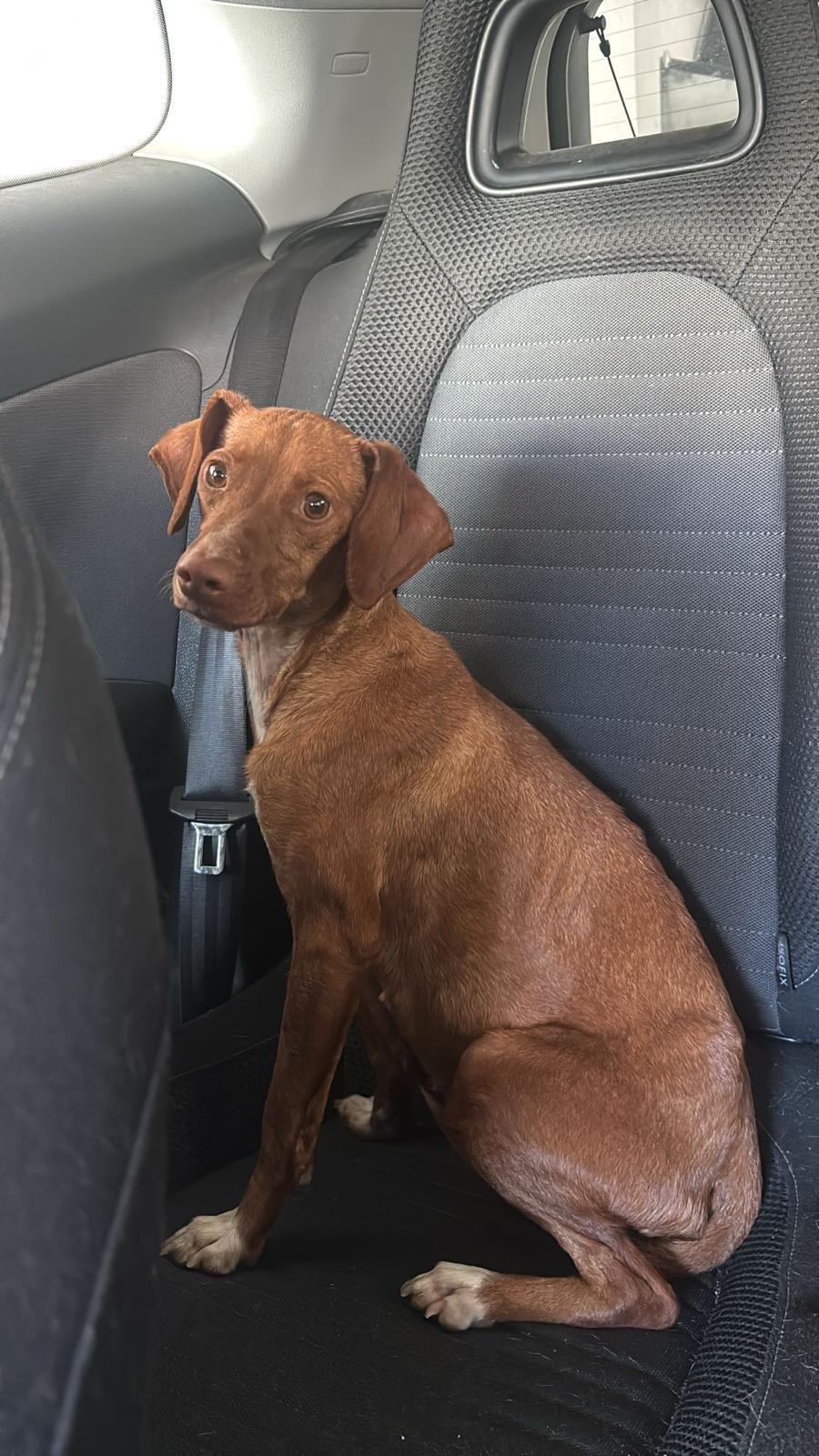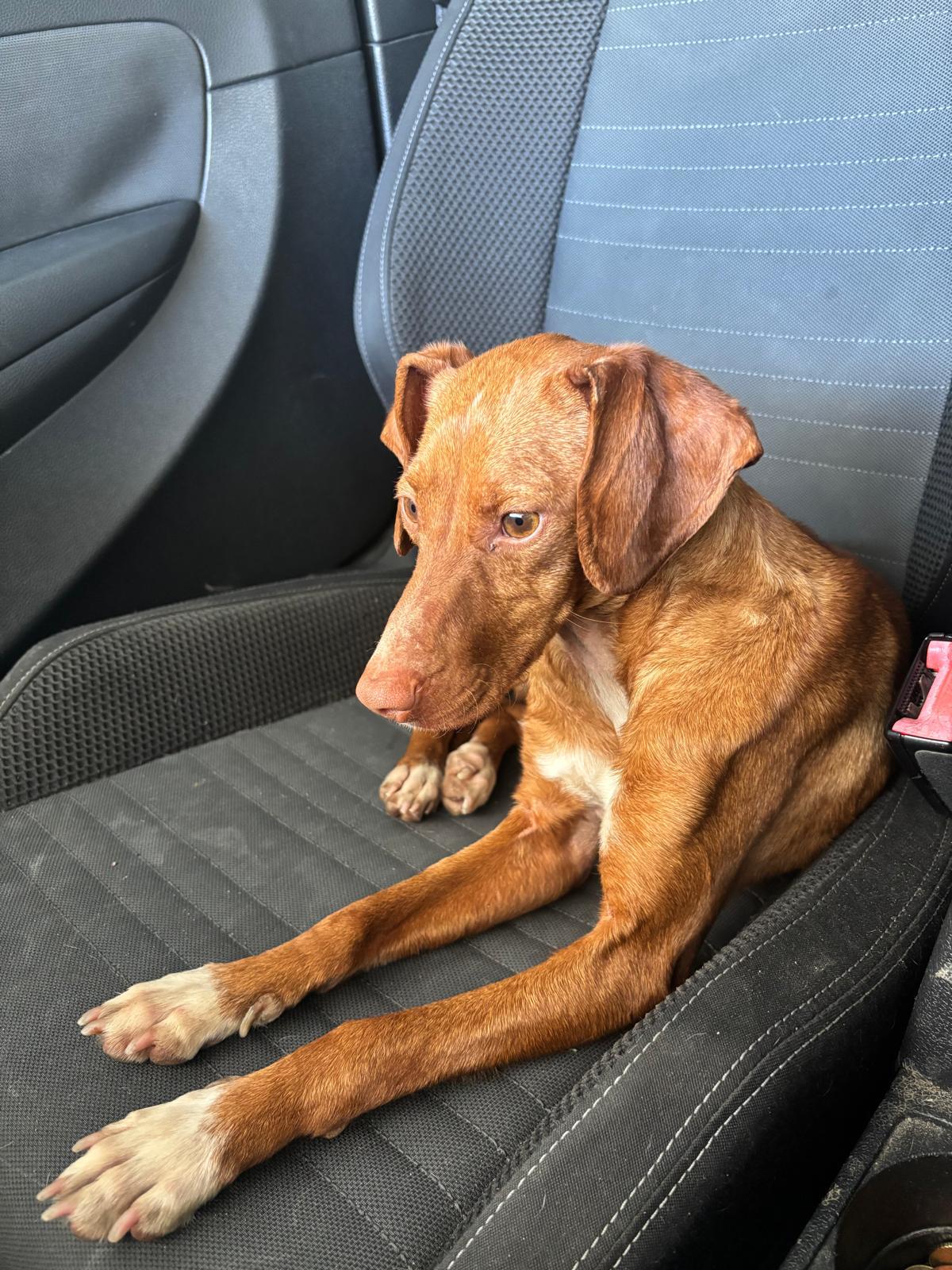 La pequeña Tina pesa unos 5 kilos y es una mestiza de podenco. Tenía la barriga muy hinchada, lo que la hacía parecer embarazada, pero probablemente se deba a la mala alimentación que ha consumido.