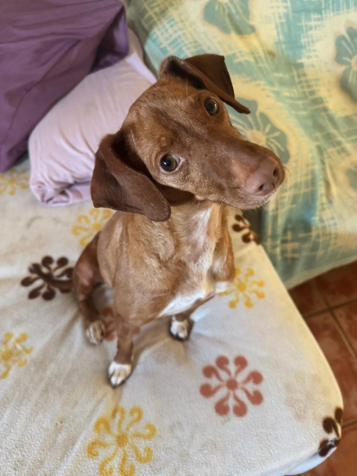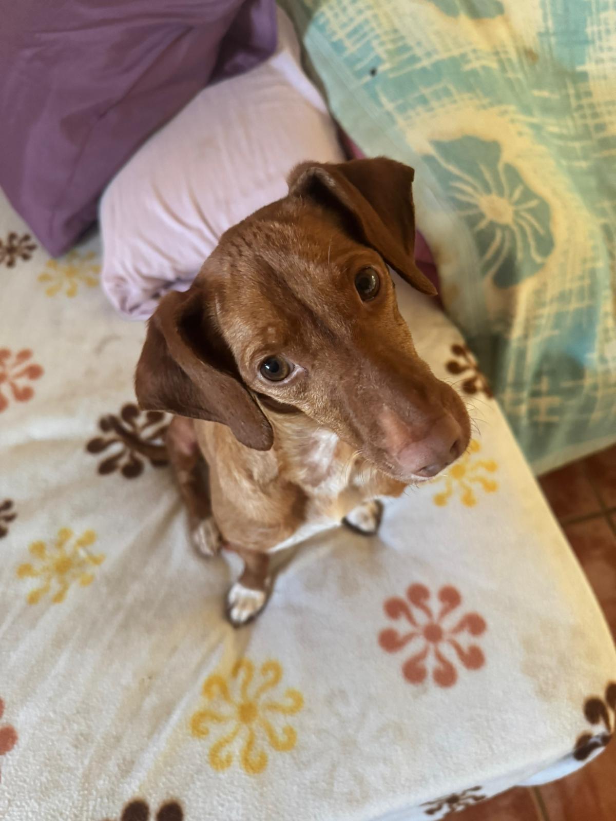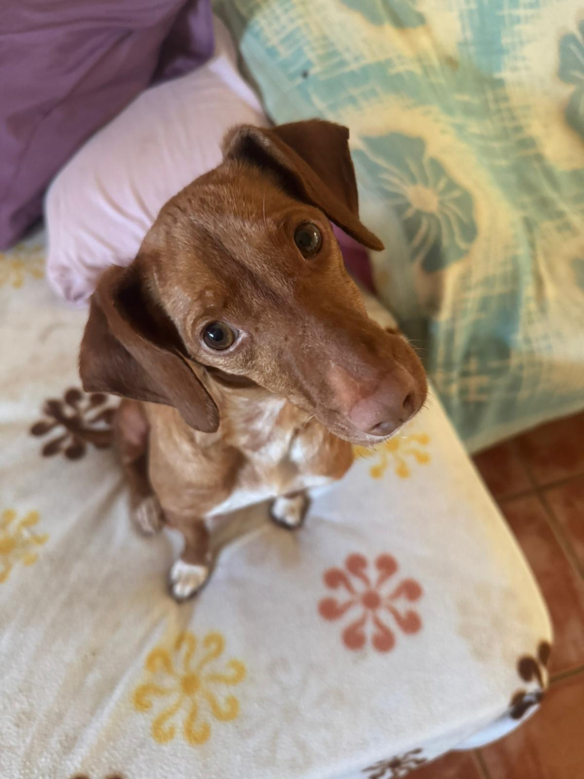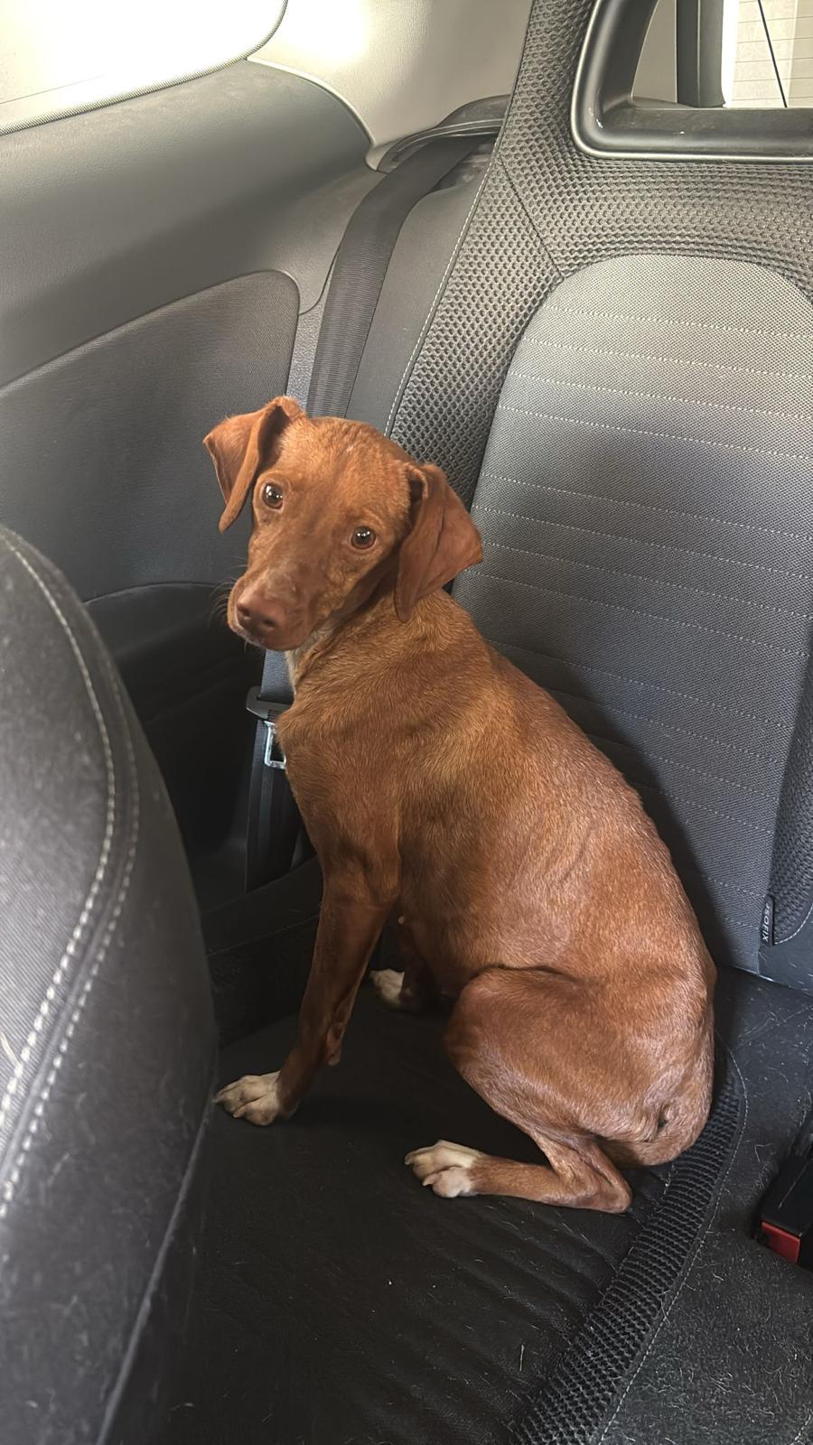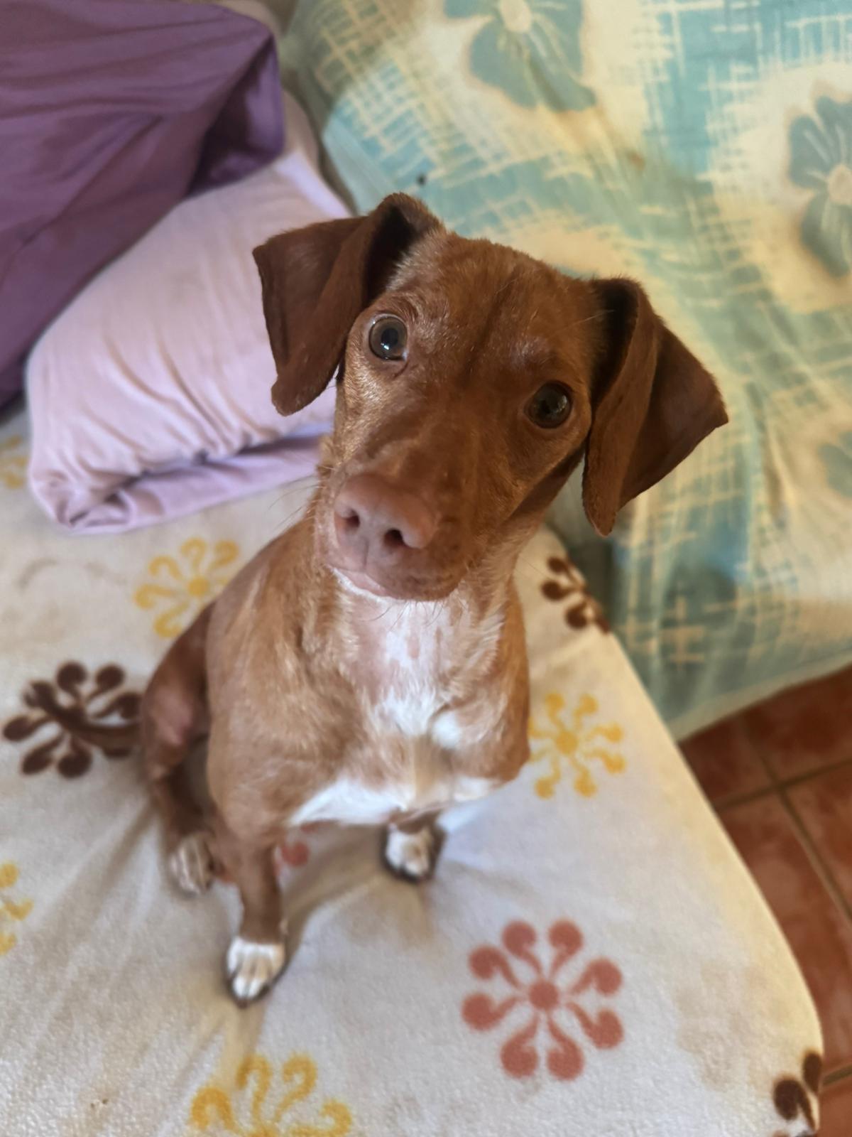 La pequeña Tina pesa unos 5 kilos y es una mestiza de podenco. Tenía la barriga muy hinchada, lo que la hacía parecer embarazada, pero probablemente se deba a la mala alimentación que ha consumido.